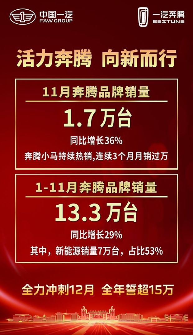 11月,奔腾品牌销量1.7万台,同比增长36%;1-11月奔腾品牌销量13.3万台,同比增长29%,其中新能源销量7万台,占比53%。奔腾小马实现连续3个月月销过万。一汽奔腾全力冲刺,全年销量誓超15万台。