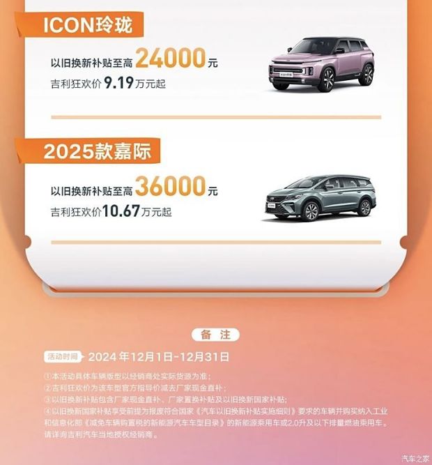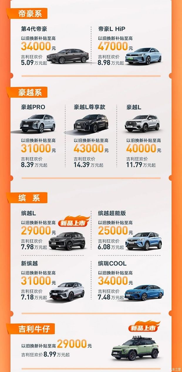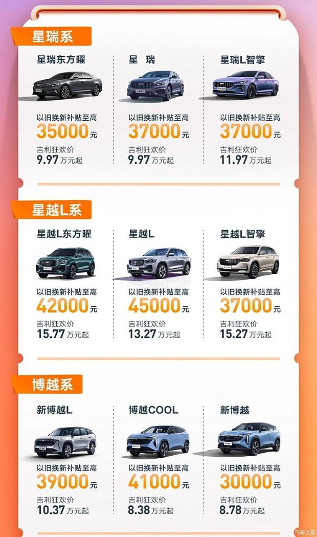 具体车型来看,星瑞系列:星瑞东方曜优惠后9.97万起,星瑞优惠后9.97万起,星瑞L智擎优惠后11.97万起;星越L系:星越L东方曜优惠后15.77万起,星越L优惠后13.27万起,星越L智擎优惠后15.27万起;博越系:博越L优惠后10.37万起,博越COOL优惠后8.38万起,博越优惠后8.78万起;帝豪系:帝豪优惠后5.09万起,帝豪L Hip优惠后8.98万起;豪越系:豪越PRO优惠后8.39万起,豪越L尊享款优惠后14.39万起,豪越L优惠后11.79万起;缤系:缤越L优惠后7.98万起,缤越超能版优惠后6.08万起,缤越优惠后7.18万起,缤瑞COOL优惠后7.48万起;吉利牛仔优惠后8.99万起;ICON玲珑优惠后9.19万起;嘉际优惠后10.67万起。