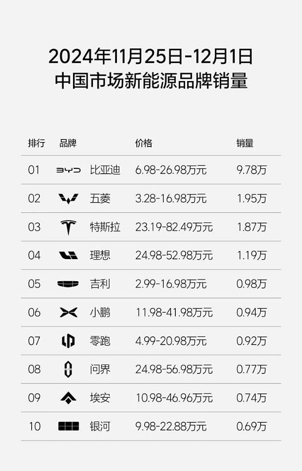 具体来看,今年第48周(11月25日至12月1日)比亚迪销量高达9.78万辆,以巨大优势领跑新能源市场,高于上月的9.48万辆的销量。
