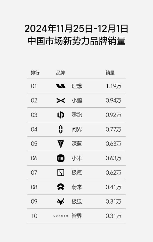 新势力周度销量榜中排名第八至第十位的品牌分别是蔚来、极狐和智界,第48周终端销量分别为0.41万辆、0.31万辆和0.31万辆。