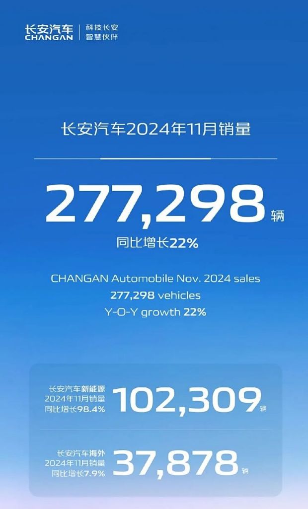 【长安汽车11月销量快报】日前,长安汽车官方公布了最新月度销量数据。数据显示,2024年11月长安汽车销量达到277298辆,同比增长22.0%。其中,新能源销量超过10万辆,达到102309辆,同比大幅增长98.4%;海外市场销量7878辆,同比增长7.9%。