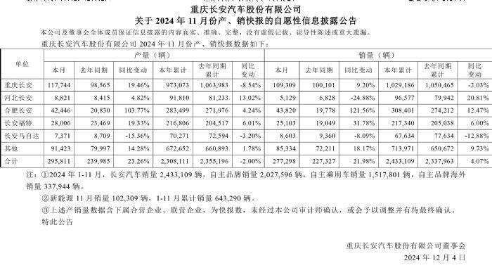 2024年1-11月,长安汽车累计销量超过240万辆,达到2433109辆,同比增长4.1%。其中,自主品牌销量超过200万辆,达到2027596辆;自主品牌乘用车销量1517801辆;自主品牌海外销量337944辆;新能源累计销量643290辆。