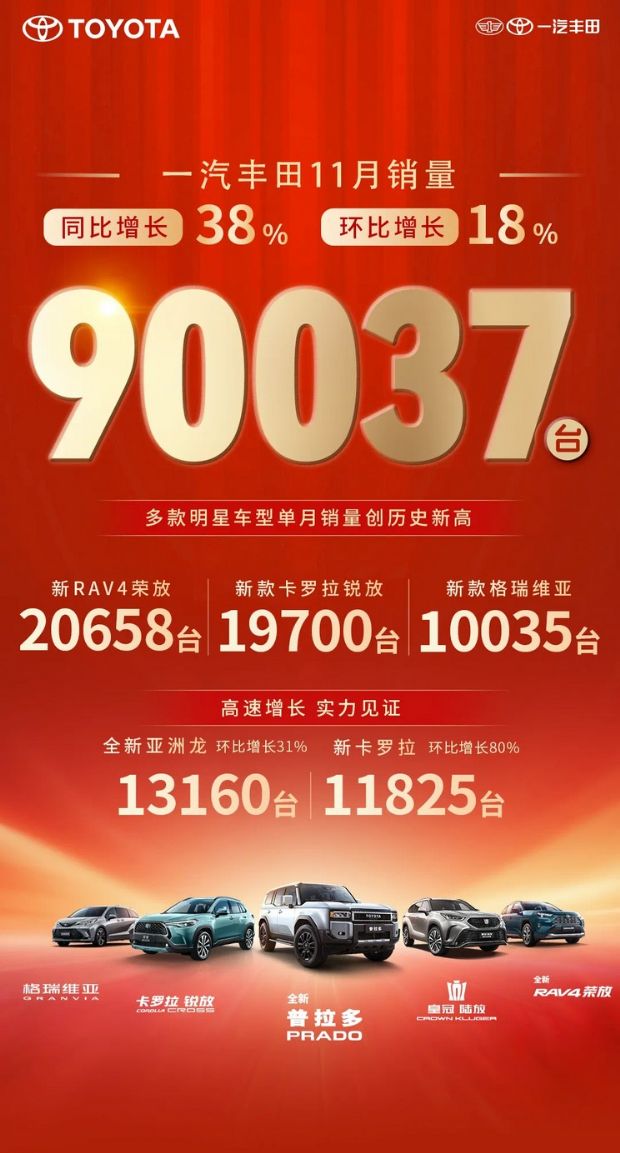 其中,一汽丰田11月销量为90037辆,同比增长38%,表现出色。旗下RAV4荣放销量20658辆,卡罗拉锐放销量19700辆,格瑞维亚销量10035辆,亚洲龙销量13160辆,卡罗拉销量11825辆。今年1-11月,一汽丰田累计销量703268辆。