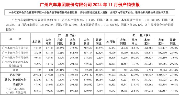 广汽丰田销量则要逊色不少,从广汽集团公布的销量数据来看,11月广汽丰田批发销量为73000辆,同比下跌15.12%。今年1-11月,广汽丰田累计批发销量660878辆,同比22.49%。