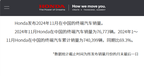 今年1-11月,本田汽车累计在中国市场终端销量74.0万辆,同比减少30.7%,无缘实现年度销量百万辆的目标。