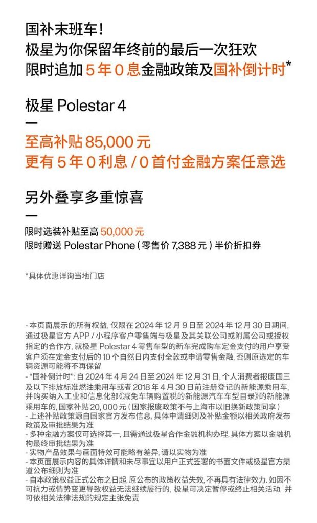 Polestar极星官方针对旗下中大型SUV——Polestar 4推出最新购车政策,限时追加5年0息金融政策,此外该车还提供至高补贴8.5万元、限时选装补贴至高5万元、限时赠送Polestar Phone(零售价7388元)半价折扣券等,活动时间截止2024年12月30日。