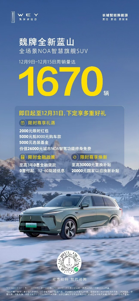正值岁末购车旺季,魏牌全新蓝山还为广大消费者准备了丰厚的下定尊享限时礼遇。自12月10日至12月31日,下定魏牌全新蓝山即可获得2000元限时红包、5000元直抵8000元购车款、5000元选装基金、价值26000元城市NOA智驾功能终身免费,以及丰富灵活的金融贷款政策;置换用户还可享受至高3万元置换补贴、2万元国家以旧换新补贴等,助力更多用户轻松拿下全场景智慧旗舰SUV,畅享高端豪华美好出行生活。