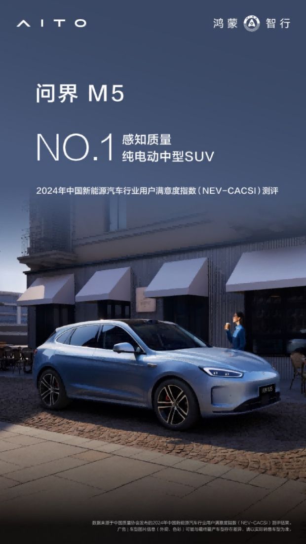 基于如此优秀的智能实力及主被动安全实力,问界新M5自然也获得了行业及用户的极大认可。根据2024年中国新能源汽车行业用户满意度指数(NEV-CACSI)测评结果,问界M5获得纯电动中型SUV感知质量第一名。这一成绩也是产品质量的有力实证。