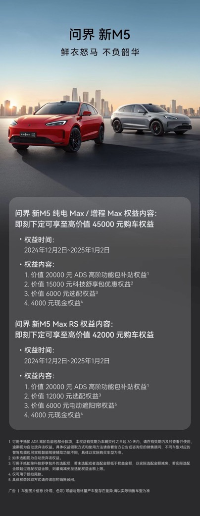值得一提的是,2025年1月2日前下定问界新M5,可享至高价值45,000元限时购车权益,包括价值20,000元的ADS高阶功能包补贴权益、价值15,000元的科技舒享包限时免费权益、价值6,000元选配权益等。在多重购车权益之下,当下可谓购买问界新M5的最佳时机。如果您近期想买车,考虑冬季用车,不妨看看问界新M5,或许会给您带来不一样的体验。