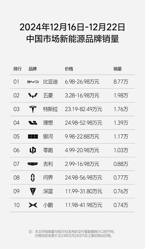 中国市场新能源品牌销量前三名分别为:1.比亚迪8.77万辆;2.五菱1.98万辆;3.特斯拉1.76万辆。