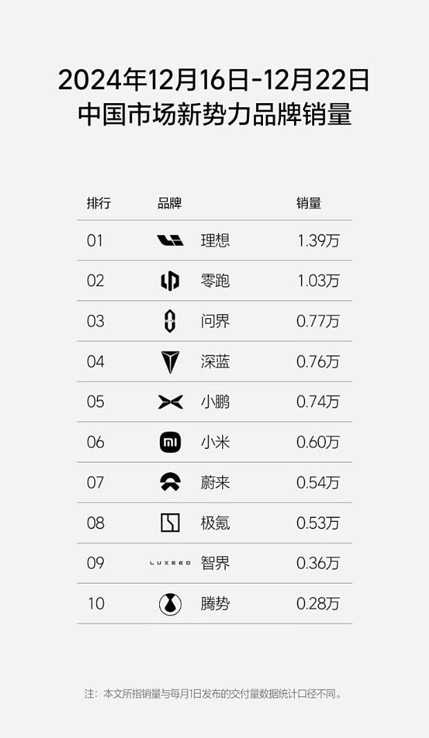 中国市场新势力品牌销量前三名分别为:1.理想1.39万辆;2.零跑1.03万辆;3.问界0.77万辆。