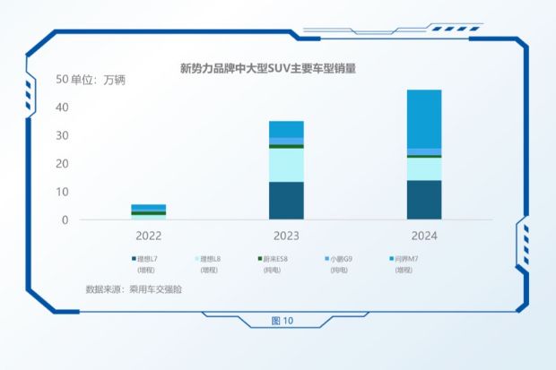 《报告》指出,中国新能源汽车产销量连续多年位居世界第一,伴随新能源SUV渗透率的不断提高,以电动化、智能化见长的新势力品牌也取得了突飞猛进的成果,电动化、智能化加持下的中大型SUV正逐步获得消费者的青睐。当下的中大型SUV市场可谓群雄逐鹿,“蔚小理”均已早早布局,其他新势力品牌、传统品牌也在纷纷布局。