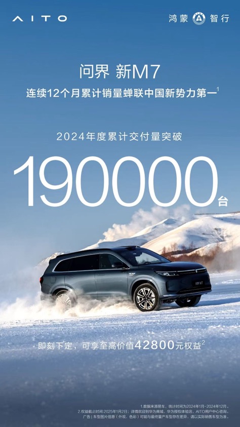 随着2024年尾声的临近,终端销售市场彻底进入了白热化阶段,各大汽车品牌试图在激烈的市场竞争中占据一席之地。在这场没有硝烟的战争中,问界新M7凭借优异的智能体验和精准的市场定位,脱颖而出,年度累计交付超19万辆。