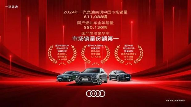 官方表示,在豪华中大型轿车细分市场,奥迪A6L以全年17.7万辆的销量刷新年度销量纪录,细分市场份额突破30%。奥迪Q5L实现逆势增长,2024年度销量达到14.9万辆,同比增长12%,细分市场份额超过26%。奥迪A3家族与奥迪Q3家族2024全年销量达到9.9万辆,市场份额突破32%。
