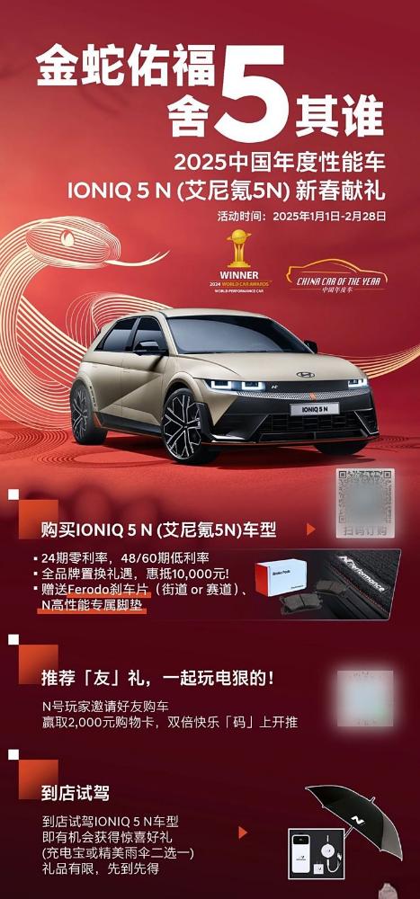 北京现代日前宣布,即日起至2025年2月28日,购买IONIQ 5 N可享24期零利率、48/60期低利率;全品牌置换抵10000元;赠送Ferodo刹车片(街道/赛道)、N高性能专属脚垫。