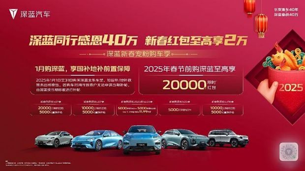2025年春节前(截至28日)购深蓝至高享20000元限时现金红包。新春购深蓝S07享20000元限时红包5000元置换补贴、深蓝L07享10000元限时红包5000元置换补贴、新春购深蓝2025款SL03享5000元限时红包+5000元置换礼、新春购深蓝S05享5000元限时红包、新春购深蓝G318享10000元限时红包+5000元置换补贴。