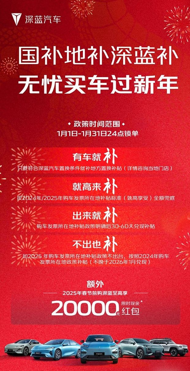 具体为:可以享受国补地补前置保障(因购车时间导致客户无法申请当期补贴由深蓝按当期标准进行补贴),并且为春节前(截至28日)购买深蓝的消费者提供至高20000元的限时红包;同时,深蓝还承诺,在1月锁单的消费者,符合深蓝汽车置换条件就补地方置换补贴,还按2024年/2025年购车发票所在地补贴标准(孰高享受)全额兜底,在购车发票所在地补贴政策明确后30-60天兑现补贴,如2025年购车发票所在地补贴政策不出台,按照2024年购车发票所在地政策补贴(不晚于2026年1月兑现)。