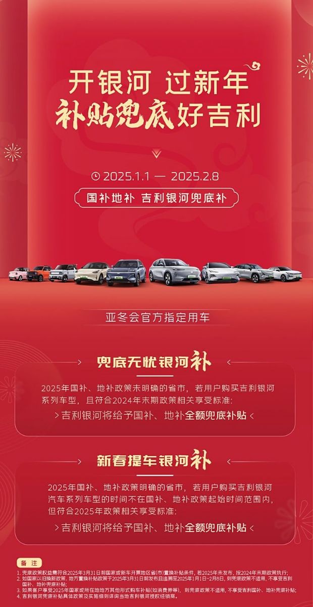 吉利银河日前推出补贴兜底活动,限时为1月1日-2月8日。据悉,2025年国补、地补政策未明确的省市,若用户购买吉利银河系列车型,且符合2024年末期政策相关享受标准:吉利银河将给予国补、地补全额兜底补贴。2025年国补、地补政策明确的省市,若用户购买吉利银河汽车系列车型的时间不在国补、地补政策起始时间范围内,但符合2025年政策相关享受标准:吉利银河将给予国补、地补全额兜底补贴。