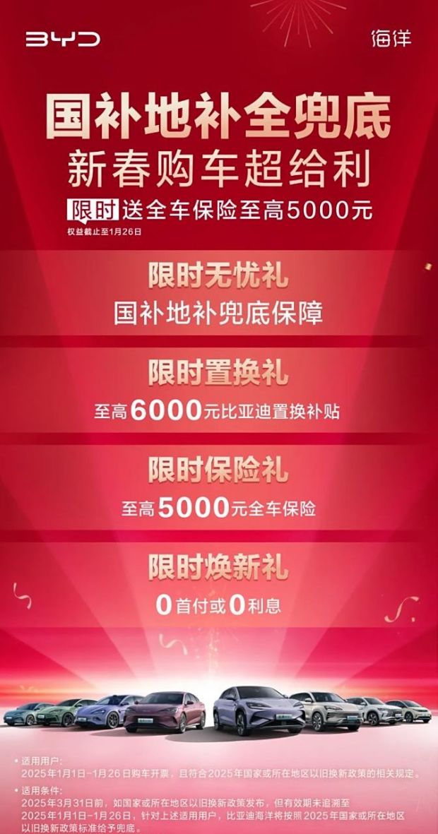 据官方消息,比亚迪海洋网日前推出新春购车礼,限时送全车保险至高5000元,权益截止至1月26日。限时至高6000元比亚迪置换补贴,限时0首付0利息。