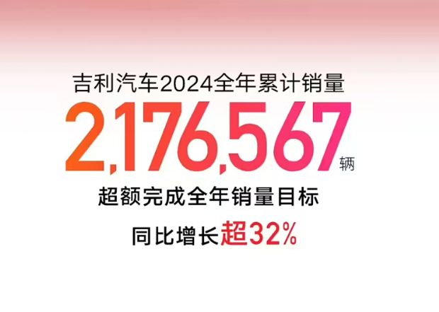 吉利品牌销量首次突破200万辆,2024年全年销量217.7万辆,排名第四位,同比增长32.0%。其中,新能源汽车全年销量88.8万辆,同比增长92%;海外市场销量40.4万辆,同比增长53%。从旗下主要品牌的销量来看,吉利品牌全年销量166.9万辆(其中银河销量49.4万辆);极氪品牌全年销量28.5万辆;领克品牌2024年销量22.2万辆。