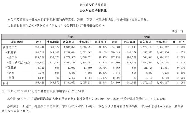 具体来看,比亚迪汽车2024年全年销量达到超过420万辆,以427.2万辆的销量夺得2024年度汽车厂商销量冠军,同比增长41.3%,超额完成年初制订的360万辆的年度销量目标。其中,比亚迪王朝系列全年销量209万辆,海洋系列全年销量194万辆。