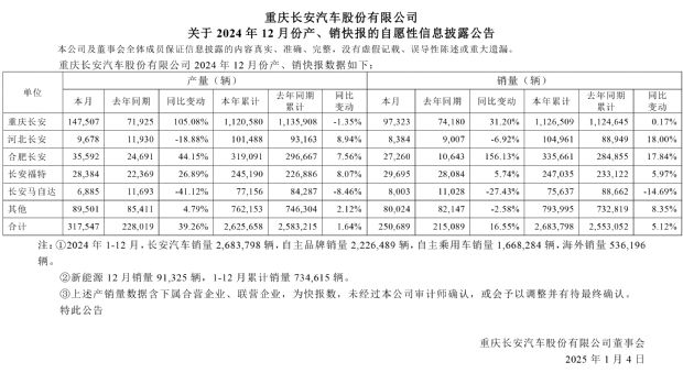 长安汽车排名第二位,2024年全年销量达到268.4万辆,同比增长5.12%。其中,自主品牌全年销量222.6万辆,自主品牌乘用车全年销量166.8万辆,海外市场全年销量53.6万辆。2024年1-12月,长安汽车共售出新能源汽车73.5万辆。