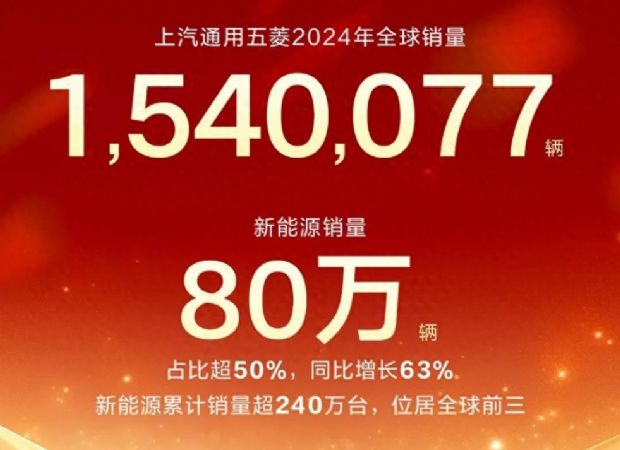 上汽通用五菱日前公布的销量数据显示,2024年全年上汽通用五菱全球总销量达到154万辆。其中,新能源汽车全年销量突破80万辆,占比首次超过50%,同比增长63%;出口销量22.5万辆,同比增长6.4%。从主要车型销量来看,2024年销量最高的是五菱宏光MINIEV家族,全年销量超过26万辆;五菱缤果家族全年销量23.7万辆;五菱星光家族全年销量突破10万辆。此外,宝骏品牌2024年销量为4.4万辆。