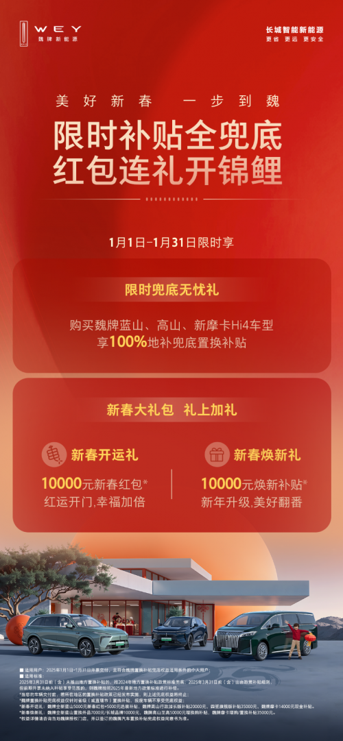 如今,随着新年的脚步临近,考虑到不少人会选择在此时换新座驾,魏牌特别推出了“美好新春 一步到魏——限时补贴全兜底 红包连礼开锦鲤”钜惠活动,凡1月1日-1月31日期间购买全新蓝山的客户,均可享受100%地补兜底置换补贴,同时,还有10000元新春红包和10000元焕新补贴,助力新年轻松焕然一新!