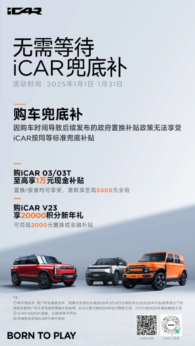 随着国家发改委新“国补”政策的发布,新能源汽车市场再迎利好。个人消费者报废或置换旧车购买新能源乘用车,可享受至高2万元的补贴。iCAR品牌积极响应,推出新春回馈活动:即日起至2025年2月28日(含),在iCAR App支付5000元下定锁单iCAR V23的用户,可获得2万积分,积分可兑换官方商城精品或2000元置换/金融补贴。对于因购车时间无法享受后续政府置换补贴的用户,iCAR提供兜底补贴,确保用户购车无忧。综合国补和政策权益,换新购买iCAR V23各车型优惠至高2.2万元。