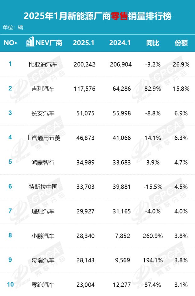 2025年1月国内新能源乘用车零售销量十强车企排名解析