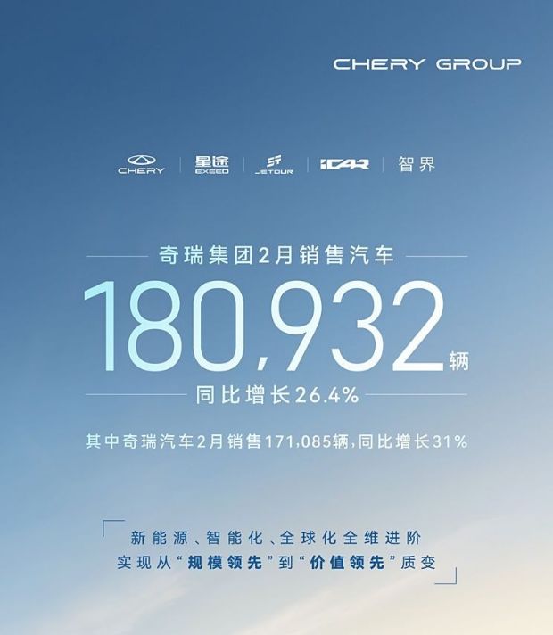 近日,奇瑞集团公布了2025年2月的销量数据,再次展现出其在汽车市场中的强劲竞争力。数据显示,2月奇瑞集团整体销售汽车180,932辆,同比增长26.4%,这一成绩不仅超出了市场预期,也为全年的销售目标开了一个好头。