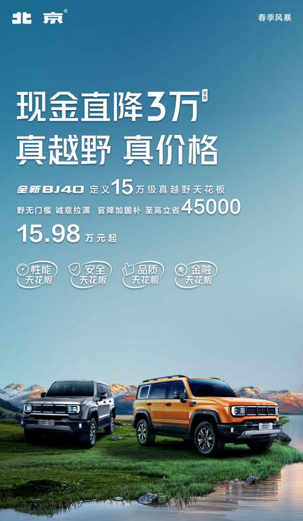 北京越野旗下的硬派SUV BJ40开启限时超值优惠,仅需15.98万起即可入手。与此同时,BJ30也不甘示弱,限时价格低至8.99万起。