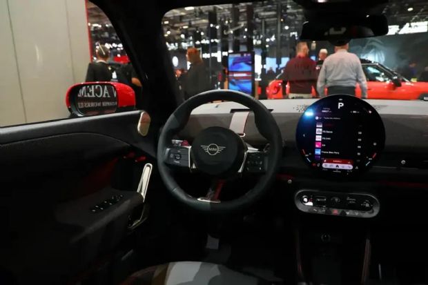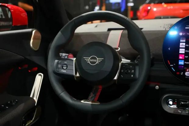 进入车内,其内饰布局与电动 MINI COOPER 保持一致。值得一提的是,方向盘在两点钟和十点钟位置进行了加厚设计,为驾驶者提供了更好的握感。MINI 巧妙运用数字化优势,秉持 “化繁为简” 的设计哲学,驾驶舱内仅保留了方向盘、拨杆开关,以及全球首个圆形 OLED 中央显示屏,简洁而不失科技感。