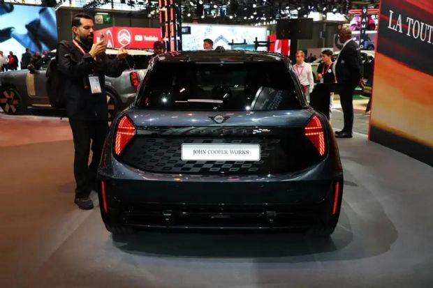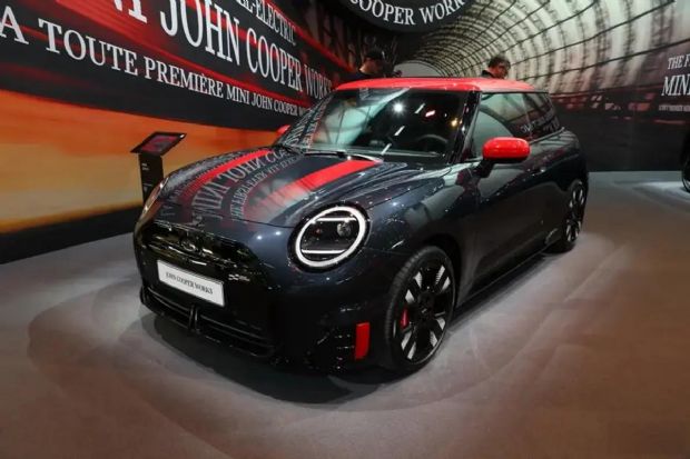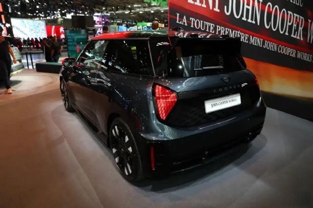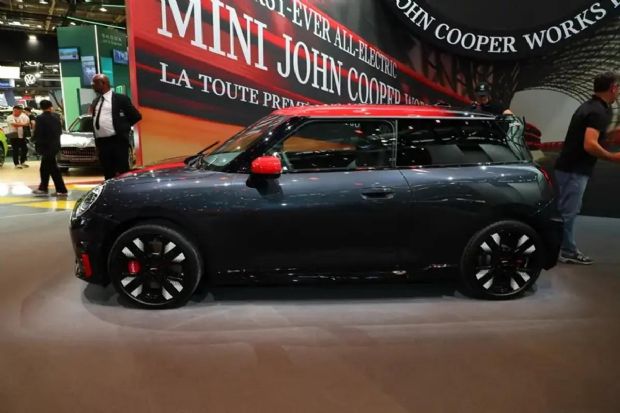 再把目光转向另一款全新 MINI John Cooper Works。外观上,它整体延续了全新电动 MINI 的造型,但在细节处融入了 JCW 运动组件,使其更具动感活力。新车中网采用全黑化设计,并带有 JCW 专属标识,MINI 车标同样进行了黑化处理,辨识度极高。