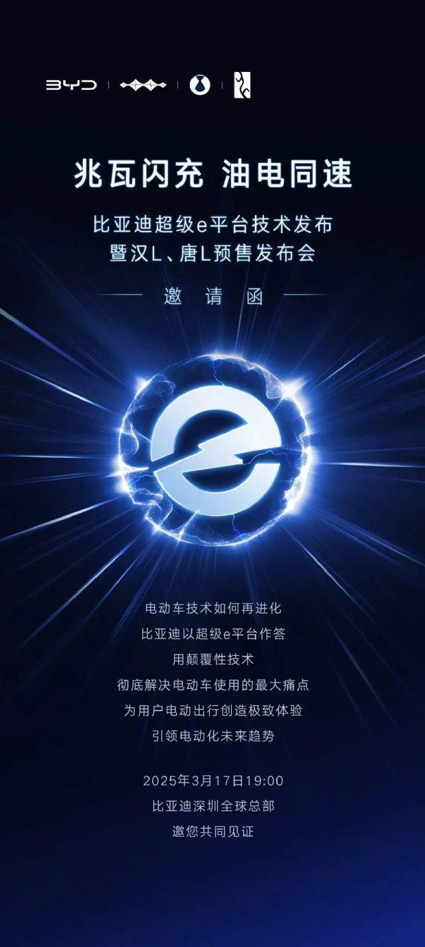 各位车友注意啦!3月14日深圳比亚迪总部即将上演一场"电动车界春晚"——超级e平台技术发布会!这次主角可不简单,除了大家期待的汉L、唐L新车预售,比亚迪还要放大招:充电比加油快的"兆瓦闪充"技术,还有全新一代刀片电池!