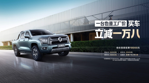 金刚炮8AT不仅有硬核实力,更有诚意满满的价格,售价9.98万元起,用户花手动挡的钱就能买到自动挡皮卡。同时,金刚炮终端优惠力度空前,一台也是工厂价,买车立减一万八,性价比直接拉满。即日起至4月30日,购买金刚炮限时综合钜惠至高18000元,可享6000元现金礼、2000元老友礼、5000元置换礼,以及至高7万2年0息等诸多礼遇……福利多多,相比同级车型简直不要太划算。