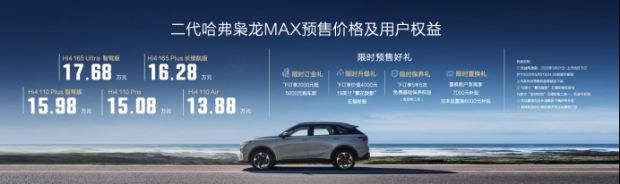 为回馈广大用户对哈弗的支持,二代哈弗枭龙MAX还推出了四重限时预售好礼。包括限时订金礼:下订享2000元抵5000元购车款;限时升级礼:下订享价值4000元19英寸“繁花旋影”五辐轮毂;限时保养礼:下订享5年5次免费基础保养权益(含首保/工时);限时置换礼:置换客户享本品置换7000元补贴,非本品置换6000元补贴。二代哈弗枭龙MAX以极具诚意的价格,让电混四驱触手可及。