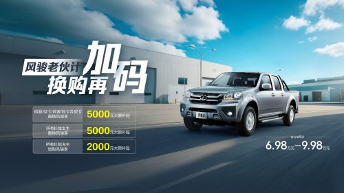 风骏老伙计,换购再加码。即日起至4月30日,任意品牌微面/微卡/轻客/轻卡及皮卡置换风骏皮卡享5000元大额补贴;所有长城车主置换风骏皮卡享受5000元大额补贴,增购风骏皮卡享受2000元大额补贴。此外,现在长城炮品牌旗下车型优惠力度也很大,购买享限时综合钜惠至高33000元(2.4T长城炮高寒版不享受此优惠),诚意十足,价值拉满。