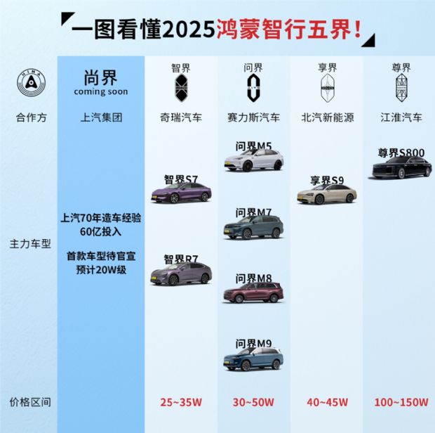 尚界的加入,进一步拓展了鸿蒙智行的版图。此前,问界、智界、享界、尊界已在不同细分市场取得成绩,尚界则聚焦主流消费市场,与其他品牌形成差异化定位和优势互补,共同满足市场的多元需求。