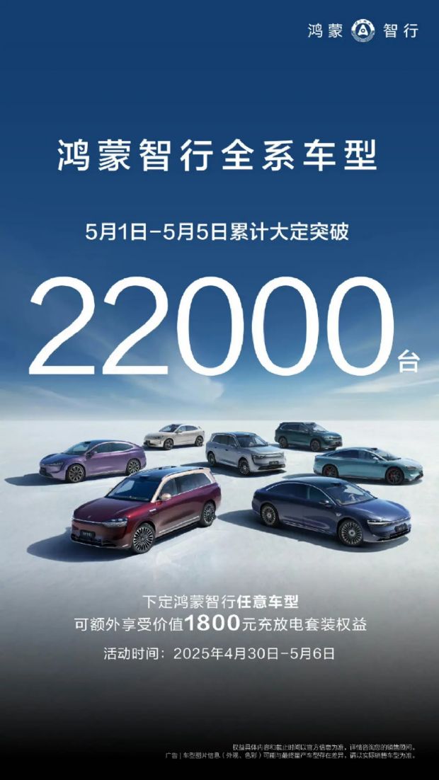 5月6日,鸿蒙智行官方重磅公布五一销售“战报”:2025年5月1日至5日期间,全系车型大定数量强势突破22000台,展现出强劲的市场竞争力。