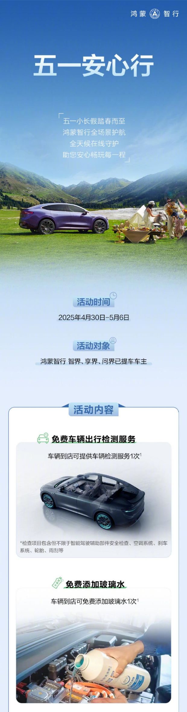 鸿蒙智行敏锐地捕捉到了用户的这些需求,顺势推出“五一安心行”专项服务活动。该活动于4月30日启动,一直持续到5月6日,覆盖全国鸿蒙智行用户中心,全方位涵盖五一假期前后的各种出行场景,旨在为用户打造全场景护航、全天候守护的安心出行体验。