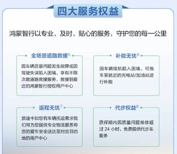 不仅如此,鸿蒙智行还带来了四大服务权益。全场景道路救援服务让车主们遇到车辆质量问题导致故障,或是因驾驶失误陷入困境时,能够安心无忧,不限次数的救援服务会将车辆拖至最近的鸿蒙智行授权用户中心。补能无忧服务针对车辆续航问题,当车辆因续航不足陷入困境时,可将车拖至就近的充电站或加油站进行补能。返程无忧服务则为有车辆托运需求的用户提供专业物流服务,确保爱车安全送达目的地。而代步权益在质保期内因质量问题维修超过24小时的情况下,免费提供代步车服务,最大程度减少车辆维修对用户出行造成的不便。