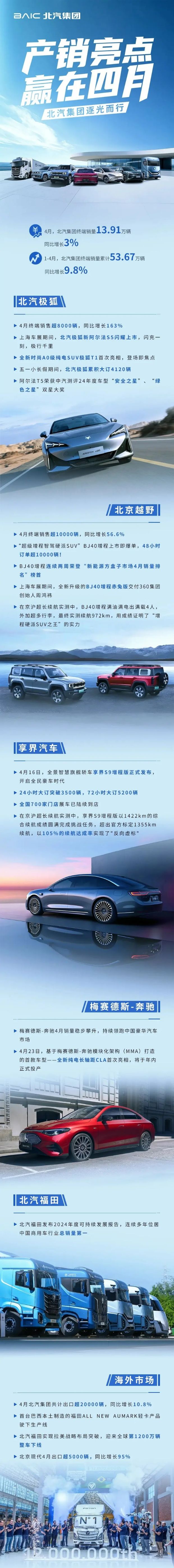 近日,北汽集团公布2025年4月最新销量数据,展现出强劲的市场竞争力。数据显示,2025年4月,北汽集团终端销量达到13.91万辆,实现同比3%的稳健增长;在1-4月累计销量方面,北汽集团终端销量累计达53.67万辆,同比增长9.8%,整体发展态势向好。