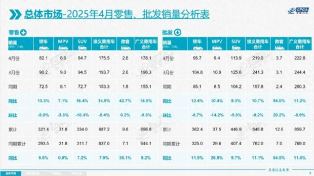 2025年4月,国内乘用车市场延续复苏态势,零售与批发销量均实现同比正增长。根据乘联会数据,4月狭义乘用车零售销量达175.5万辆,同比增长14.5%;批发销量219.0万辆,同比增长10.7%。分车型来看,SUV仍是主力增长点,零售销量84.7万辆(同比+16.4%),批发销量113.9万辆(同比+9.3%),远超轿车和MPV的表现。新能源车型的渗透率持续提升,成为拉动市场增长的核心动力。