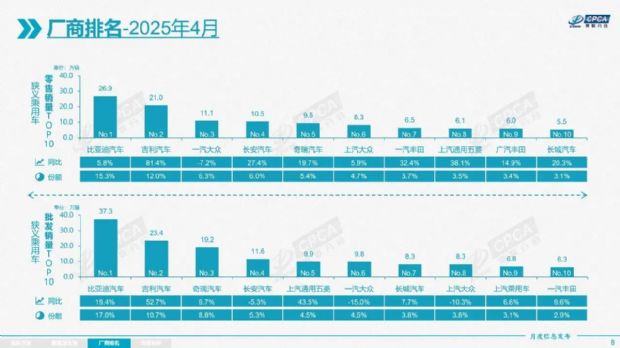 一汽大众(6.3%)、长安汽车(6.0%)、奇瑞汽车(5.4%)分列第三至第五名。值得注意的是,奇瑞凭借19.7%的同比增速,逐步缩小与头部厂商的差距,其出口业务与混动技术的突破或是关键驱动力。此外,日系品牌中仅一汽丰田(同比+32.4%)表现亮眼,而上汽大众(4.7%)与广汽丰田(3.4%)份额持续收缩,反映出合资品牌在电动化转型中的阵痛。