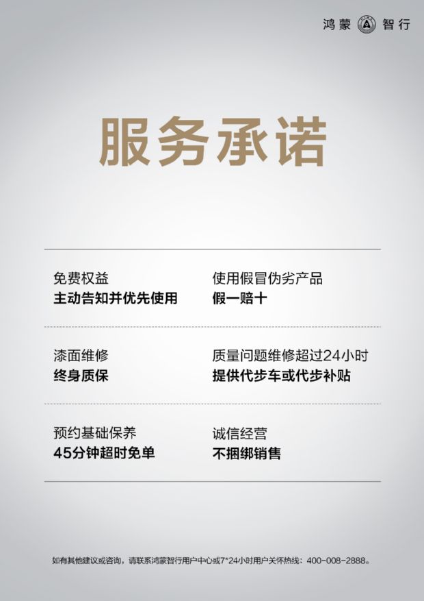 同时,鸿蒙智行通过六大服务承诺,将技术保障转化为实实在在的信用资产。漆面维修终身质保,让车主们不用担心车辆漆面的后续维护问题;使用假冒伪劣产品假一赔十,保障了用户的消费权益;免费权益主动告知并优先使用,体现了服务的透明与公正;质量问题维修超过24小时提供代步车或代步补贴,减少了车辆维修对用户日常出行的影响;诚信经营,不捆绑销售,营造了良好的消费环境。而预约基础保养45分钟超时免单的承诺,更是直接切中用户对服务效率的核心诉求,树立了行业效率的新标杆。这些服务承诺并非仅在五一期间生效,而是贯穿车辆售前、售中、售后的全周期,是对行业内隐性消费、服务不透明等顽疾的有力回应,重塑了行业的透明度标准,为消费者权益保护机制提供了行业范本。