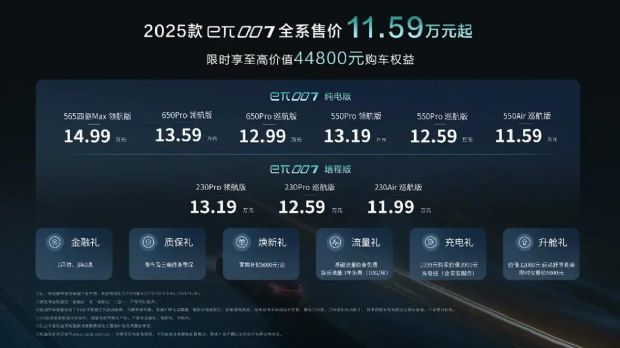 2025款东风奕派eπ007依旧提供纯电和增程双动力选择,共九款车型。增程版涵盖230Air巡航版(11.99万元)、230Pro巡航版(12.59万元)等三款车型;纯电版则包含550Air巡航版(11.59万元)、565四驱Max领航版(14.99万元)等六款车型。