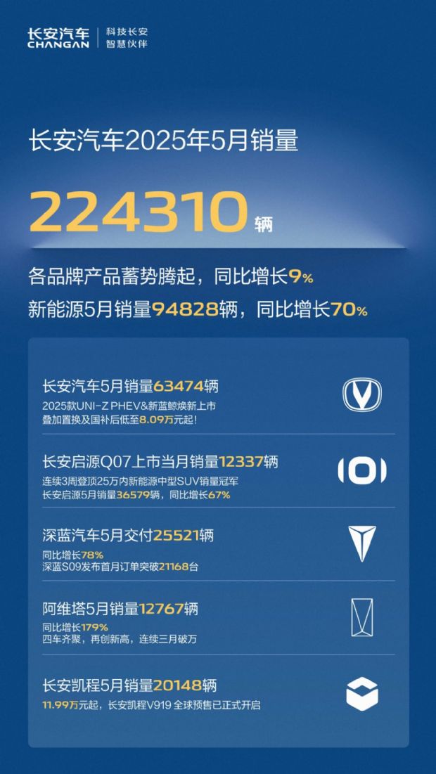 在竞争激烈的汽车市场中,长安汽车凭借扎实布局与创新实力,交出了一份亮眼的成绩单。2025年5月,长安汽车整体销量达224310辆,同比增长9%,展现出强大的市场竞争力。新能源领域更是迎来爆发式增长,当月销量高达94828辆,同比激增70%,成为行业焦点。