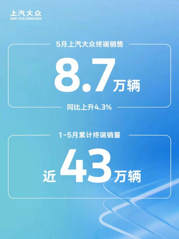 日前,上汽大众公布5月终端销量数据,共售出8.7万辆,同比上升4.3%。1-5月累计终端销量近43万辆,在竞争激烈的汽车市场中保持稳健发展态势。