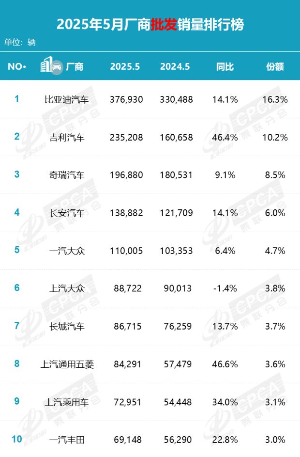 2025年5月汽车市场产销数据新鲜出炉,厂商批发销量排名呈现新态势,自主品牌表现突出,新能源汽车(NEV)持续引领增长。